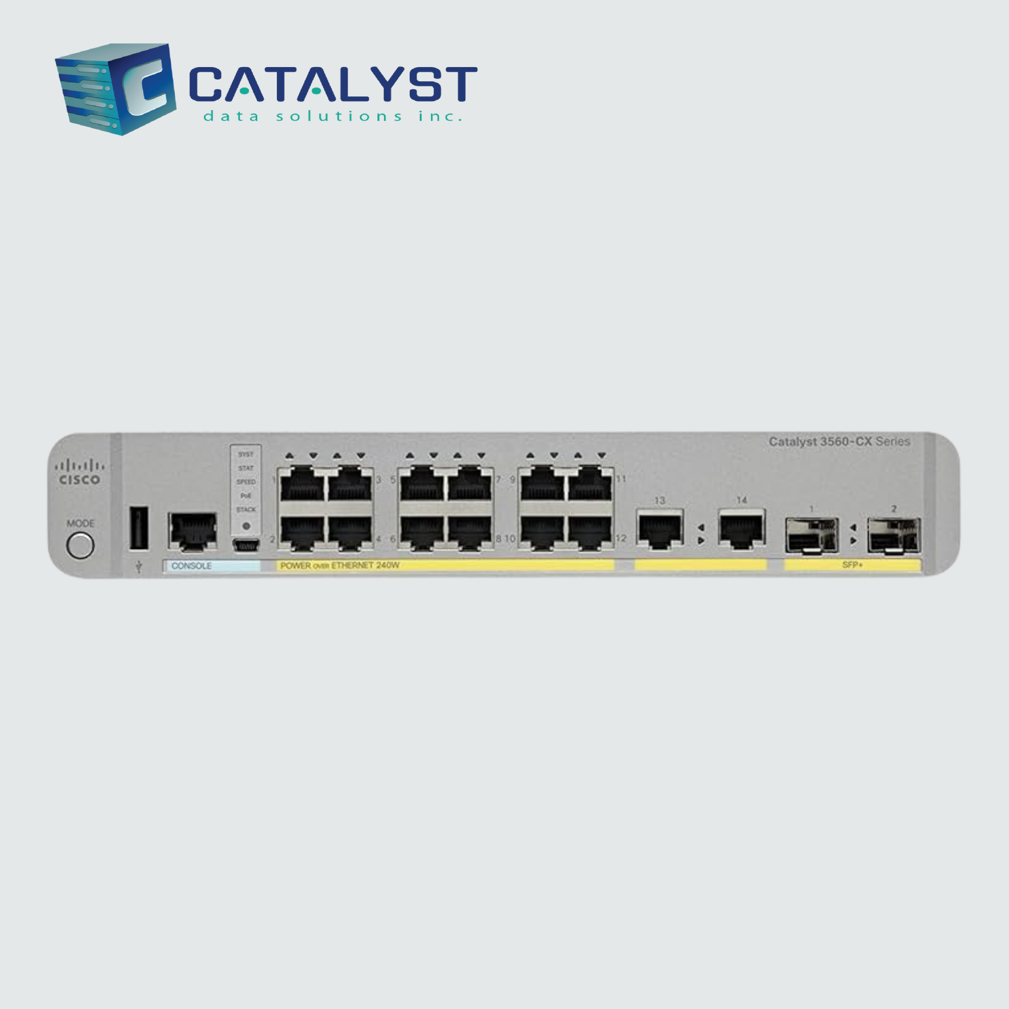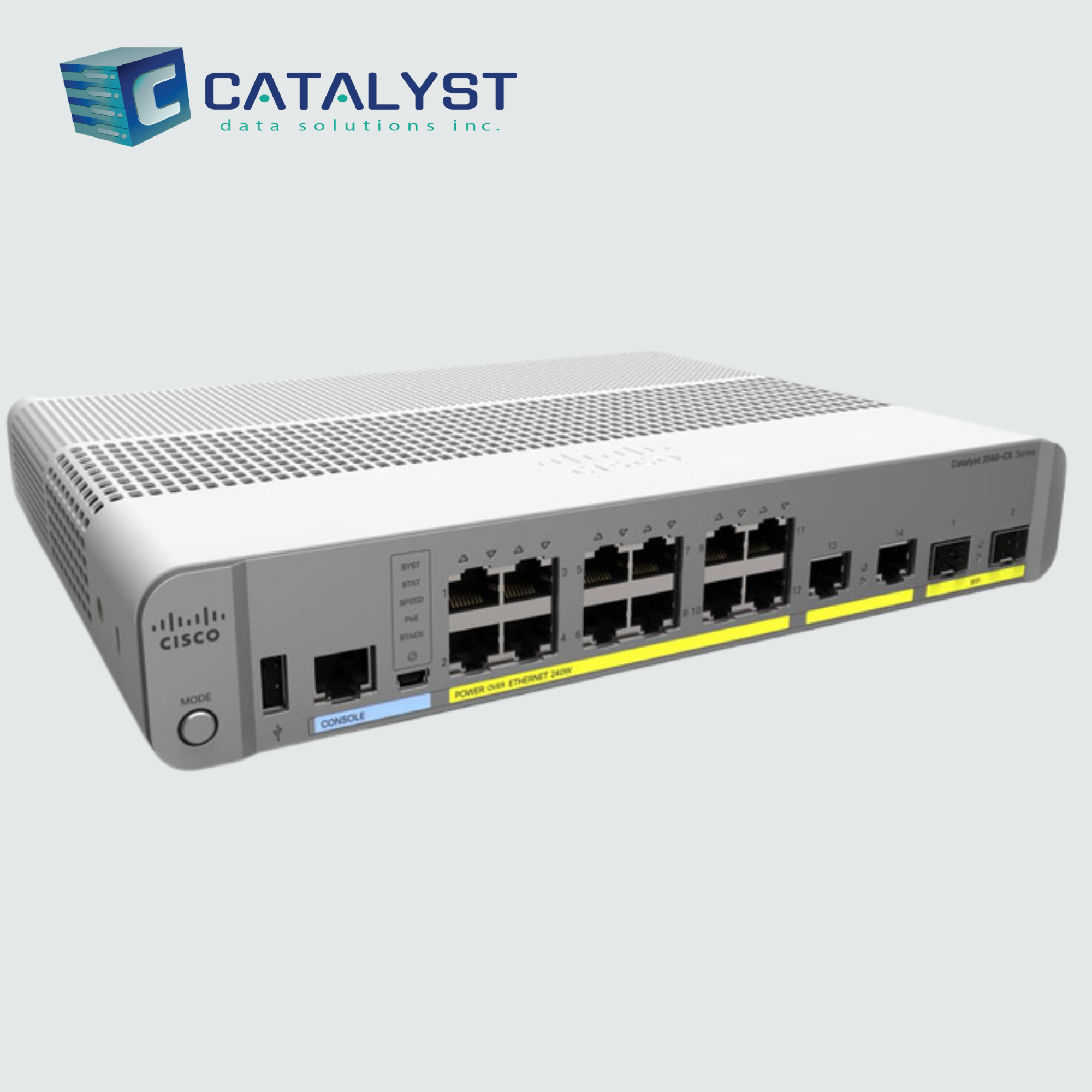 The Cisco WS-C3560CX-12PC-S Catalyst Switch is a 12-port Gigabit Ethernet PoE+ Layer 3 managed switch offering compact, fanless operation for noise-sensitive and space-limited environments.